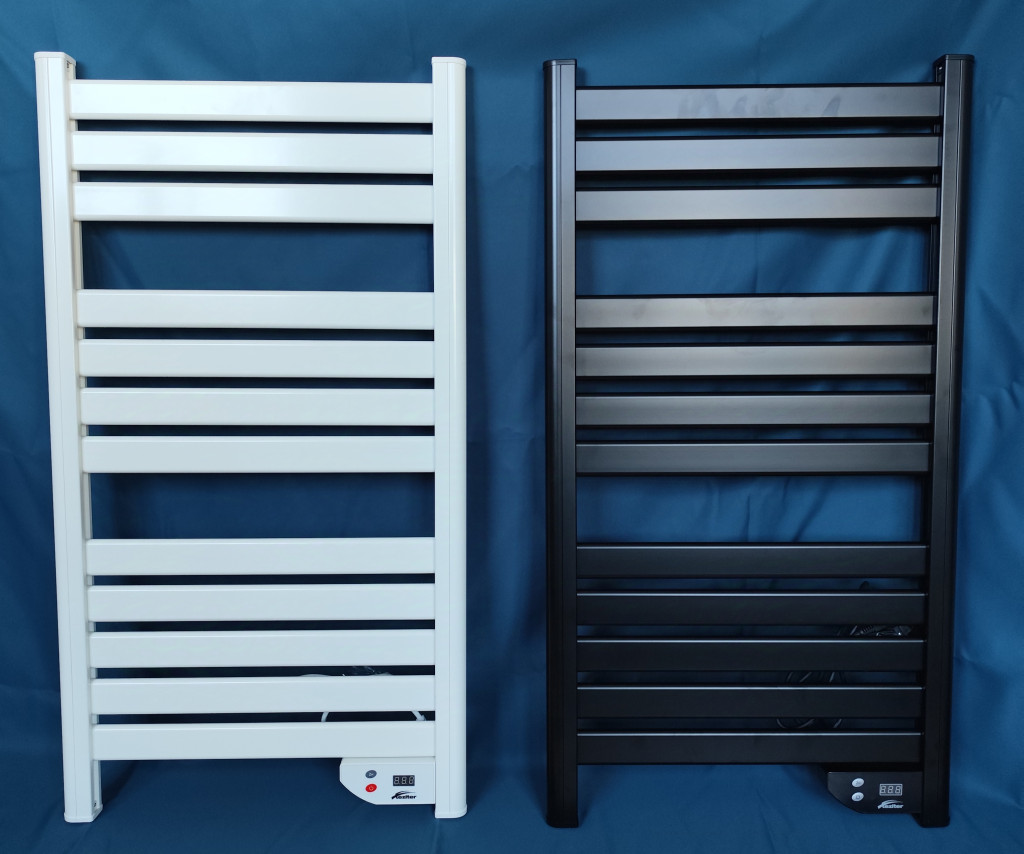 Falra szerelhető elektromos törölközőszárító. 500W teljesítmény. Fekete és fehér színben.